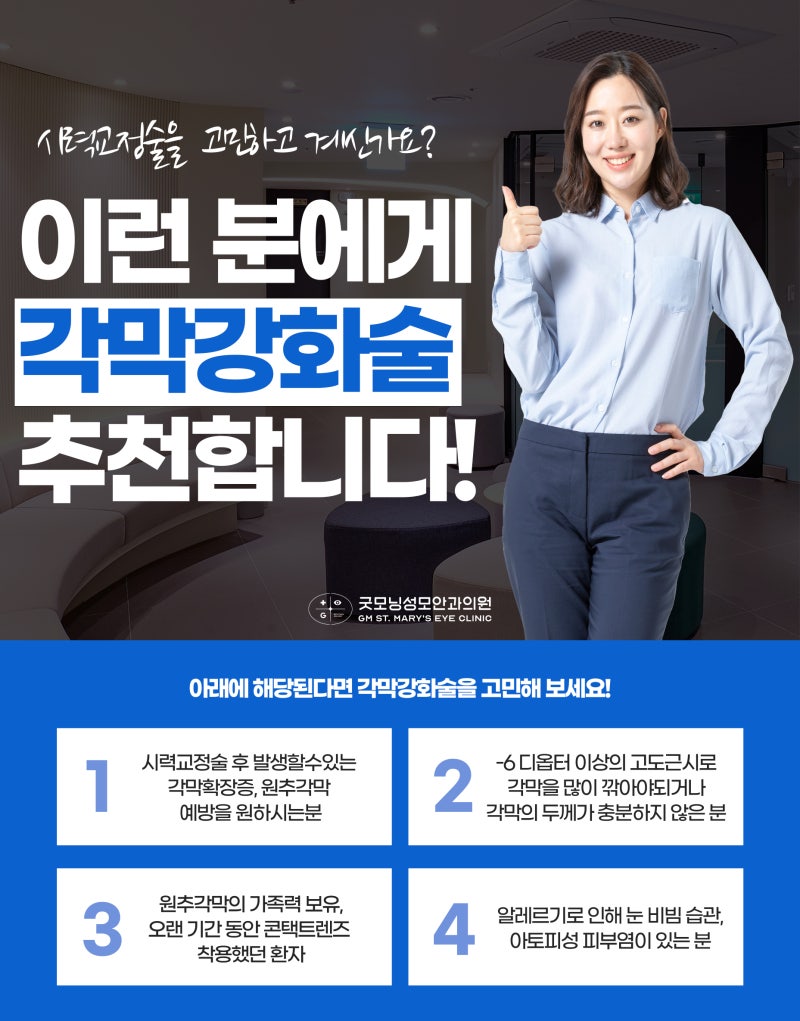 <角膜移植术> 시력교정술 후 발생할 수 있는 원추각막 및 각막확장증을 예방하기 위해 각막강화를 원하는 분, 광범위한 각막절모술이 필요한 -6디옵터 이상의 고도근시, 원추각막 가족력이 있어 콘택트렌즈 착용자 알레르기로 인해 눈을 비비는 습관이 있으신 분, 아토피성 피부염이 있으신 분, 각막이 두껍지 않은 분도 참여하실 수 있습니다. 각막강화수술의 효과와 장점 출처 : 굿모닝 성모안과