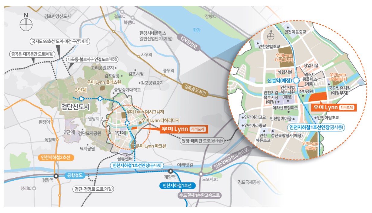 검단우미린강포레는 신역사인 101역의 역세권에 위치하여 검단신도시의 좋은 입지로 알려져 있다.