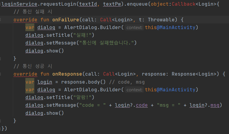 loginService.requestLogin(textId, textPw).enqueue(object:Callback<Login>{