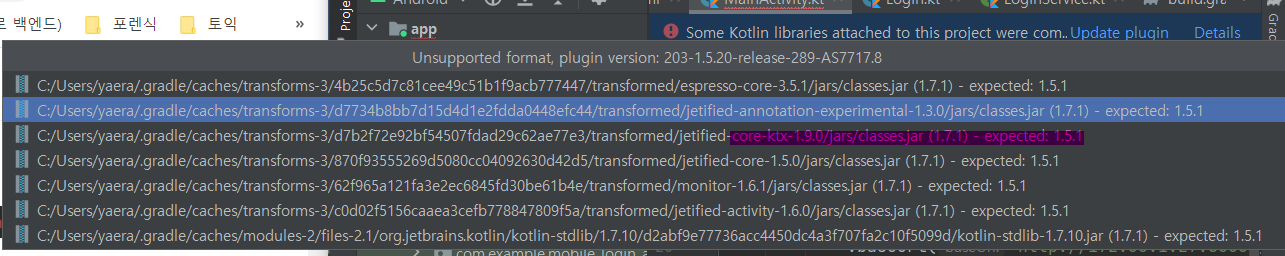내 Kotlin 버전은 1.5.20입니다. (3)과 관련하여 androidx.core:core-ktx:1.9.0을 1.5.2 또는 1.3.2로 다운그레이드하고 동기화를 실행했지만 아무런 효과가 없습니다.