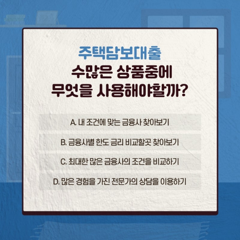 그중에서도 특히 주택담보대출 금리 부분은 실행할 금액이 큰 만큼 아주 작은 차이가 생겨도 총 상환금이나 한 달 상환액이 완전히 달라질 수밖에 없습니다.전문가의 도움으로 조회할 수 있는 여러 금융회사에 의뢰하여 한번에 확인하는 것이 가장 좋은 방법이며, 여러 조건을 한 곳에서 비교하여 실제 마트에 가서 물건을 고르듯이 본인에게 적절한 상품을 고르는데 큰 도움이 됩니다..그중에서도 특히 주택담보대출 금리 부분은 실행할 금액이 큰 만큼 아주 작은 차이가 생겨도 총 상환금이나 한 달 상환액이 완전히 달라질 수밖에 없습니다.전문가의 도움으로 조회할 수 있는 여러 금융회사에 의뢰하여 한번에 확인하는 것이 가장 좋은 방법이며, 여러 조건을 한 곳에서 비교하여 실제 마트에 가서 물건을 고르듯이 본인에게 적절한 상품을 고르는데 큰 도움이 됩니다..