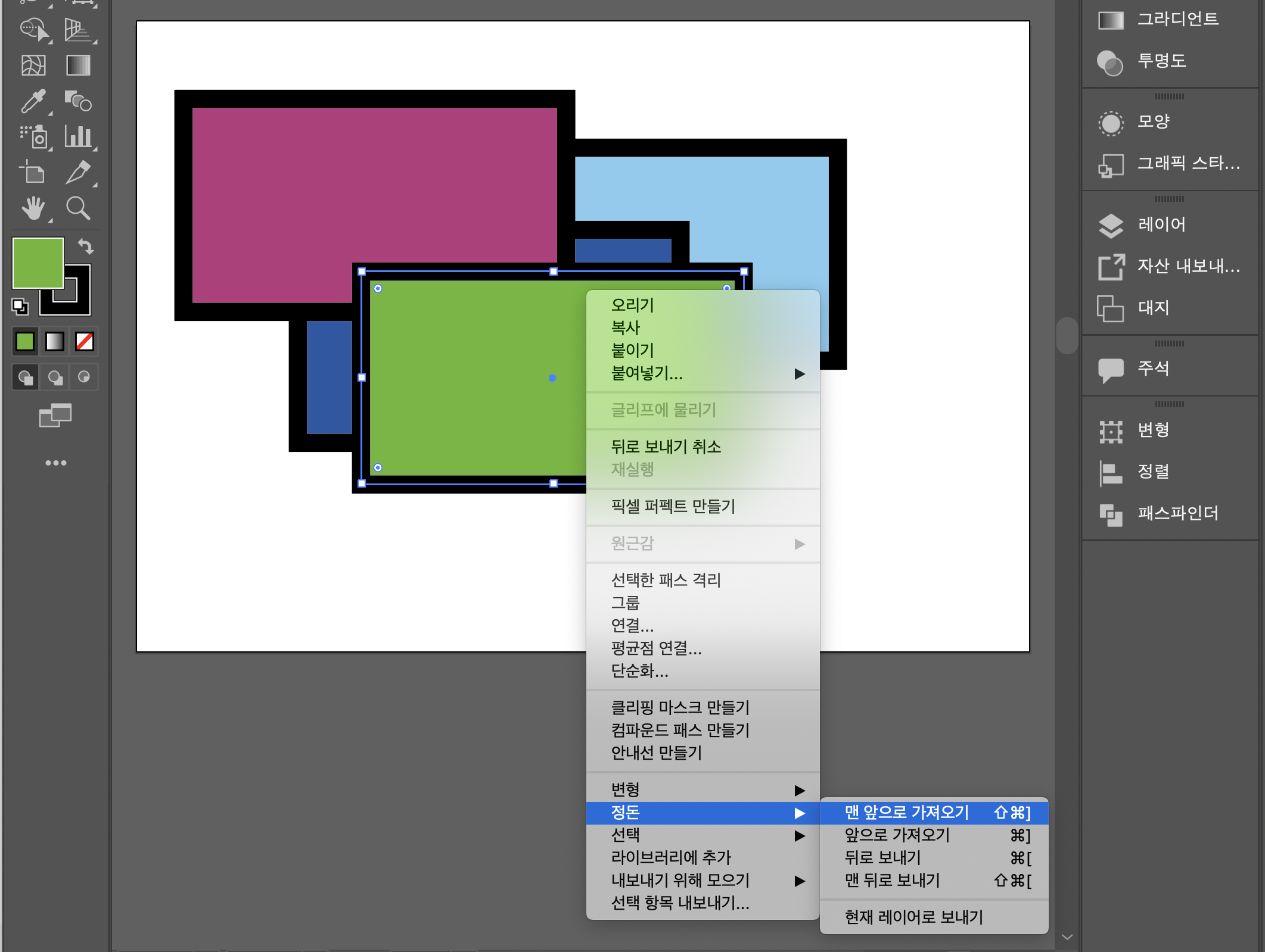배열 메뉴를 사용하여 개체의 순서를 재정렬합니다.