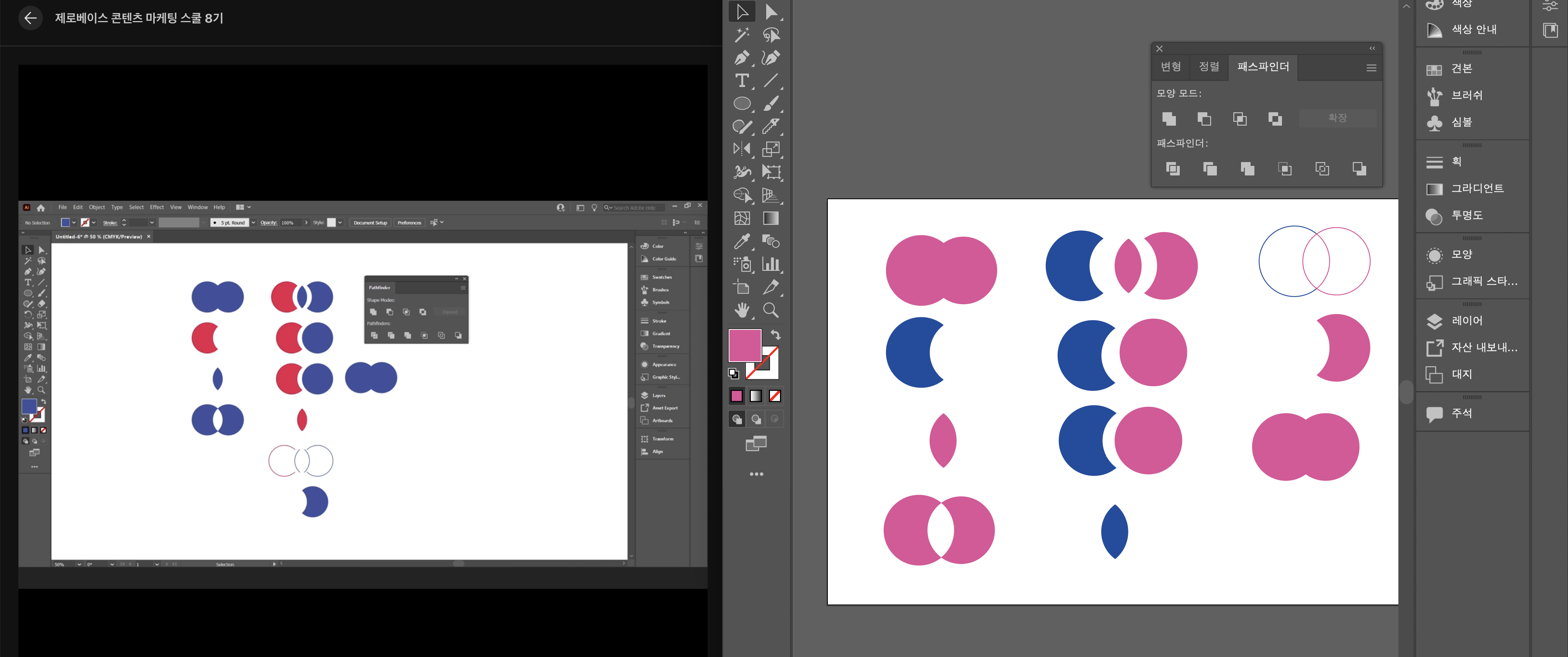 일러스트레이터에서는 개체 간의 계산을 적용하여 모양이 다른 개체로 작업할 수 있는데, 이 경우 패스파인더 패널을 사용하여 개체를 결합하거나 분할하는 등의 계산을 적용할 수 있습니다. 그리고 이 기능을 잘 활용하면 사물을 더 빠르고 정확하게 사용할 수 있습니다.