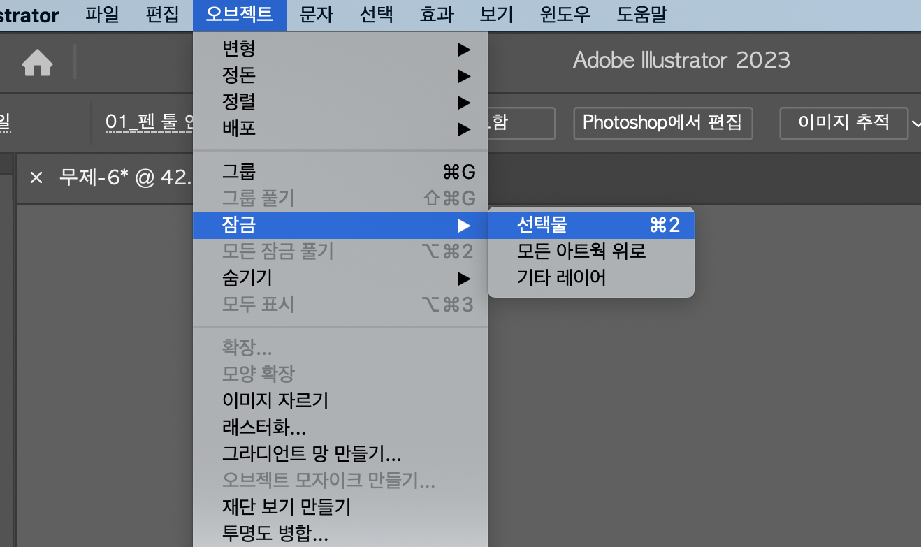 • 또는 개체 – 잠금 – 선택으로 잠글 수 있습니다. (단축키: cmd 2)