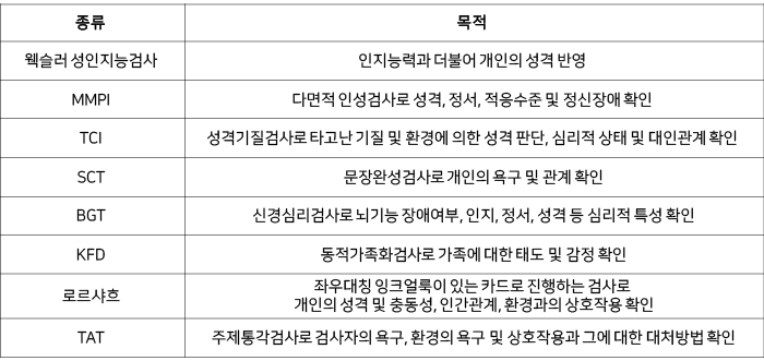 2. 정서검사의 성격적 특성, 정서상태, 대인관계 양성 등을 측정하여 다음과 같은 검사가 있습니다. MMPI-2(다면적인성검사) SCT(문장완성검사) – Rorschach(롤샤하검사) BGT(벤더도형검사) – 보조검사 TAT/CAT(주제통각검사) – 보조검사 HTP, KFD(그림검사) – 보조검사 KPRC(한국아동성평정척도) 3. 학부모검사 부모의 양육태도, 정서상태를 측정하는 검사로 MMPI-2(다면적 인성시험)와 SCT(문장완성검사)를 실시합니다.